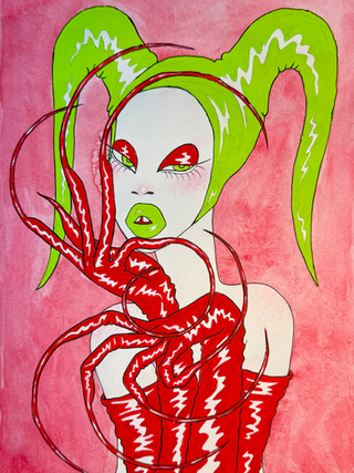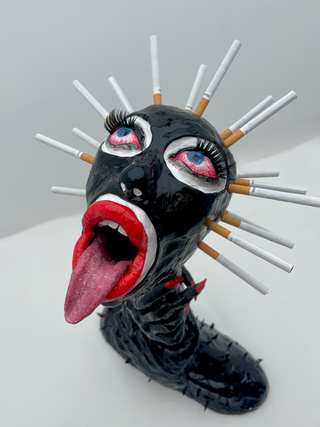 A Brighton-based sculptor working in surreal figurative forms. Using a wide range of materials such as acrylic, epoxy, and found objects, she creates stylised figures with exaggerated, doll-like features and glossy, synthetic surfaces. Her work explores femininity and womanhood in contemporary society, addressing themes of objectification, power and self-expression.